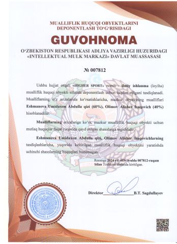 | 2292 | №007812 | Ilmiy ishlanma (loyiha) - "HIGHER SPORT" | Eshmanova Umidaxon Abdulla qizi (60%), Olimov Alisher Isaqovich (40%) | Eshmanova Umidaxon Abdulla qizi, Olimov Alisher Isaqovich | 07/03/2024 | ![]() |