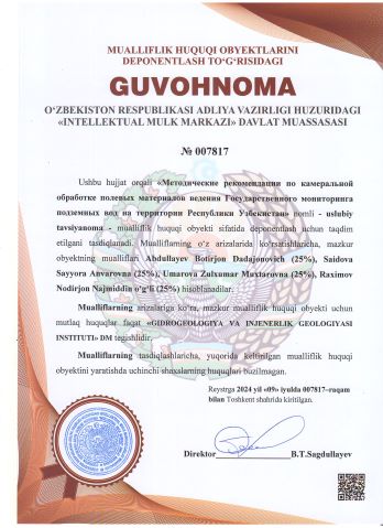 | 2287 | №007817 | Uslubiy tavsiyanoma - "Методические рекомендации по камеральной обработке полевых материалов ведения Государственного мониторинга подземных вод на территории Республики Узбекистан" | Abdullayev Botirjon Dadajonovich (25%), Saidova Sayyora Anvarovna (25%), Umarova Zulxumar Muxtarovna (25%), Raximov Nodirjon Najmiddin o‘g‘li (25%) | "GIDROGEOLOGIYA VA INJENERLIK GEOLOGIYASI INSTITUTI" DM | 07/09/2024 | ![]() |