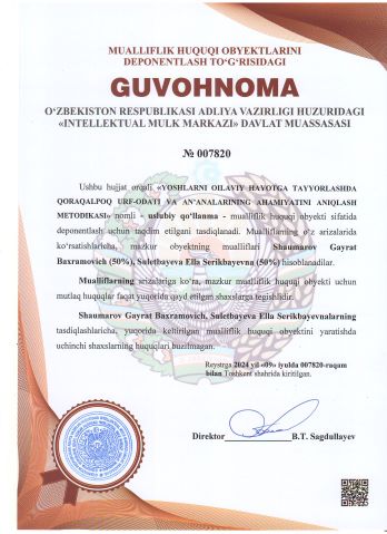 | 2284 | №007820 | Uslubiy qo‘llanma - "YOSHLARNI OILAVIY HAYOTGA TAYYORLASHDA QORAQALPOQ URF-ODATI VA AN’ANALARINING AHAMIYATINI ANIQLASH METODIKASI" | Shaumarov Gayrat Baxramovich (50%), Suletbayeva Ella Serikbayevna (50%) | Shaumarov Gayrat Baxramovich, Suletbayeva Ella Serikbayevna | 07/09/2024 | ![]() |