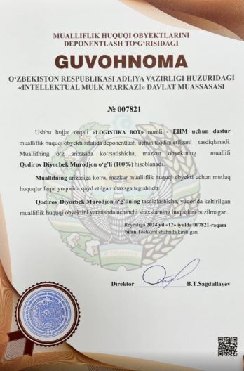 | 2283 | №007821 | EHM uchun dastur - "LOGISTIKA BOT" | Qodirov Diyorbek Murodjon o‘g’li (100%) | Qodirov Diyorbek Murodjon o‘g’li | 07/12/2024 | ![]() |