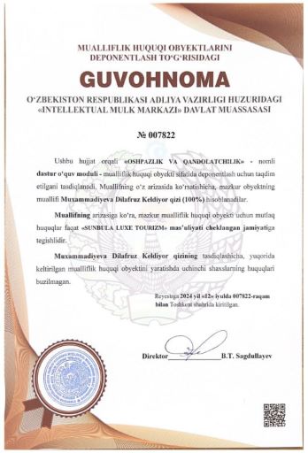 | 2282 | №007822 | Dastur o‘quv moduli - "OSHPAZLIK VA QANDOLATCHILIK" | Muxammadiyeva Dilafruz Keldiyor qizi (100%) | "SUNBULA LUXE TOURIZM" mas’uliyati cheklangan jamiyati | 07/12/2024 | ![]() |
