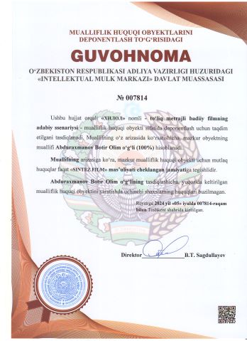 | 2290 | №007814 | To‘liq metrajli badiiy filmning adabiy ssenariysi - "ХИЛОЛ" | Abduraxmanov Botir Olim o‘g‘li (100%) | "SINTEZ FILM" mas’uliyati cheklangan jamiyati | 07/05/2024 | ![]() |