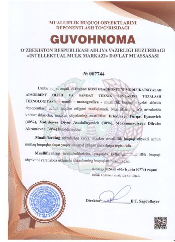 | 2360 | №007744 | Monografiya - "CHANGI KONI GLAUKONITINI MODIFIKATSIYALAB ADSORBENT OLISH VA SANOAT TEXNIK SUVLARINI TOZALASH TEXNOLOGIYASI" | Erkabayev Furqat Ilyasovich (40%), Xadjibayev Diyor Asadullayevich (30%), Muxammadiyeva Dilrabo Akromovna (30%) | Erkabayev Furqat Ilyasovich, Xadjibayev Diyor Asadullayevich, Muxammadiyeva Dilrabo Akromovna | 06/06/2024 | ![]() |