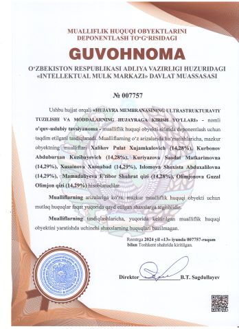 | 2347 | №007757 | O‘quv-uslubiy qo‘llanma - "HUJAYRA MEMBRANASINING ULTRASTRUKTURAVIY TUZILISHI VA MODDALARNING HUJAYRAGA KIRISH YO'LLARI" | Xalikov Pulat Xujamkulovich (14,28%), Kurbonov Abduburxan Kuzibayevich (14,28%), Kuriyazova Saodat Matkarimovna (14,29%), Xusainova Xusnabad (14,29%), Islomova Shoxista Abduxalilovna (14,29%), Mamadaliyeva E’tibor Shuhrat qizi (14,28%), Olimjonova Guzal Olimjon qizi (14,29%) | Xalikov Pulat Xujamkulovich, Kurbonov Abduburxan Kuzibayevich, Kuriyazova Saodat Matkarimovna, Xusainova Xusnabad, Islomova Shoxista Abduxalilovna, Mamadaliyeva E’tibor Shuhrat qizi, Olimjonova Guzal Olimjon qizi | 06/13/2024 | ![]() |
