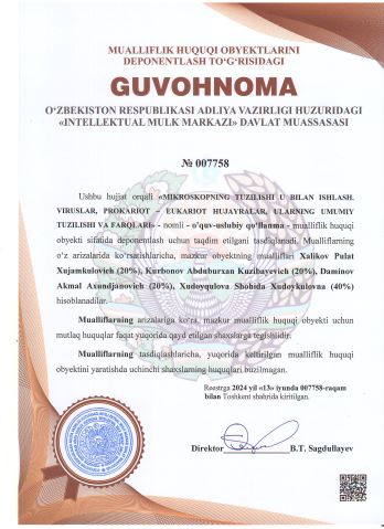 | 2346 | №007758 | O‘quv-uslubiy qo‘llanma - MIKROSKOPNING TUZILISHI U BILAN ISHLASH. VIRUSLAR, PROKARIOT – EUKARIOT HUJAYRALAR, ULARNING UMUMIY TUZILISHI VA FARQLARI" | Xalikov Pulat Xujamkulovich (20%), Kurbonov Abduburxan Kuzibayevich (20%), Daminov Akmal Axundjanovich (20%), Xudoyqulova Shohida Xudoykulovna (40%) | Xalikov Pulat Xujamkulovich, Kurbonov Abduburxan Kuzibayevich, Daminov Akmal Axundjanovich, Xudoyqulova Shohida Xudoykulovna | 06/13/2024 | ![]() |