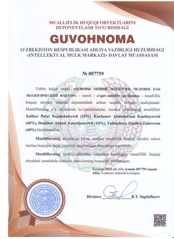 | 2345 | №007759 | O‘quv-uslubiy qo‘llanma - "ОСНОВЫ ОБЩЕЙ ЭКОЛОГИИ. ЧЕЛОВЕК КАК ЭКОЛОГИЧЕСКИЙ ФАКТОР" | Xalikov Pulat Xujamkulovich (10%), Kurbanov Abduburxan Kuzibayevich (40%), Daminov Akmal Axundjanovich (10%), Yuldasheva Zimfira Zakirovna (40%) | Xalikov Pulat Xujamkulovich, Kurbanov Abduburxan Kuzibayevich, Daminov Akmal Axundjanovich, Yuldasheva Zimfira Zakirovna | 06/13/2024 | ![]() |