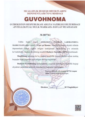 | 2343 | №007761 | O‘quv qo‘llanma - "ZOOLOGIYA FANIDAN LABORATORIYA MASHG‘ULOTLARI" | Dadayev Saydulla (100%) | Dadayev Saydulla | 06/13/2024 | ![]() |