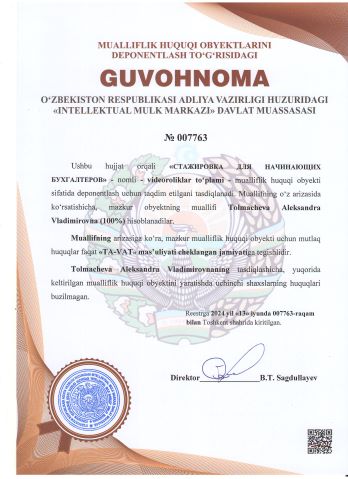 | 2341 | №007763 | Videoroliklar to‘plami - "СТАЖИРОВКА ДЛЯ НАЧИНАЮЩИХ БУХГАЛТЕРОВ" | Tolmacheva Aleksandra Vladimirovna (100%) | "TA-VAT" mas’uliyati cheklangan jamiyati | 06/13/2024 | ![]() |
