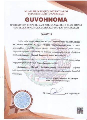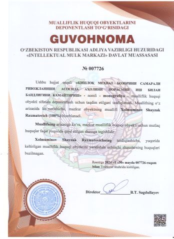 | 2379 | №007725 | Monografiya - "ҚИШЛОҚ МЕҲНАТ БОЗОРИНИНГ ШАКЛЛАНИШИ ВА РИВОЖЛАНИШИ ҲАМДА УЛАРНИ МОДЕЛЛАШТИРИШ" | Xolmuminov Shayzak Raxmatovich (100%) | Xolmuminov Shayzak Raxmatovich | 05/30/2024 | ![]() |