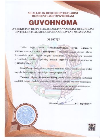 | 2377 | №007727 | Monografiya - "ЭВОЛЮЦИОННЫЙ ПУТЬ АДВОКАТА УЗБЕКИСТАНА" | Tagayeva Nigora Sirojetdinovna (100%) | Tagayeva Nigora Sirojetdinovna | 05/30/2024 | ![]() |