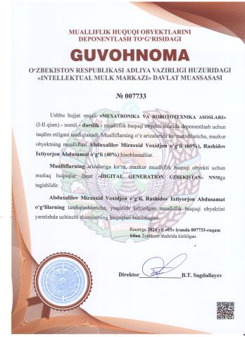 | 2371 | №007733 | Darslik - "MEXATRONIKA VA ROBOTOTEXNIKA ASOSLARI" (I-II qism) | Abduxalilov Mirzoxid Voxidjon o‘g‘li (60%), Rashidov Ixtiyorjon Abdusamat o‘g‘li (40%) | "DIGITAL GENERATION UZBEKISTAN" NNM | 06/03/2024 | ![]() |