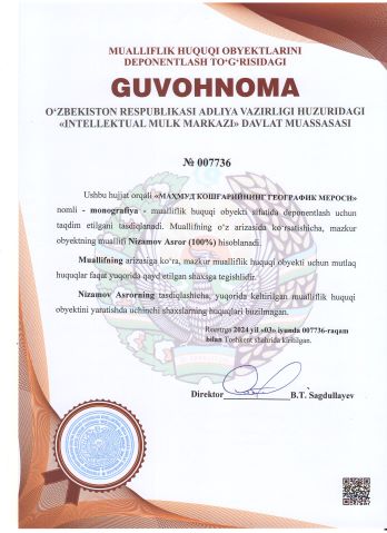 | 2368 | №007736 | Monografiya - "МАҲМУД КОШҒАРИЙНИНГ ГЕОГРАФИК МЕРОСИ" | Nizamov Asror (100%) | Nizamov Asror | 06/03/2024 | ![]() |
