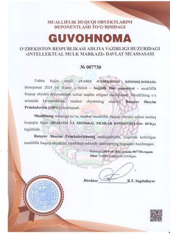 | 2374 | №007730 | Hujjatli film ssenariysi - "YANGI O‘ZBEKISTON KINOSOLNOMASI" (kinojurnal 2024 yil 4-son) | Butayev Shoyim Primkulovich (100%) | "HUJJATLI VA XRONIKAL FILMLAR KINOSTUDIYASI" DUK | 06/03/2024 | ![]() |
