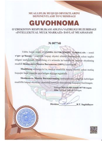| 2364 | №007740 | O‘quv qo‘llanma - "TA’LIMDA ILG‘OR XORIJIY TAJRIBALAR" | Shodmonova Munira Burxonovna (100%) | Shodmonova Munira Burxonovna | 06/05/2024 | ![]() |