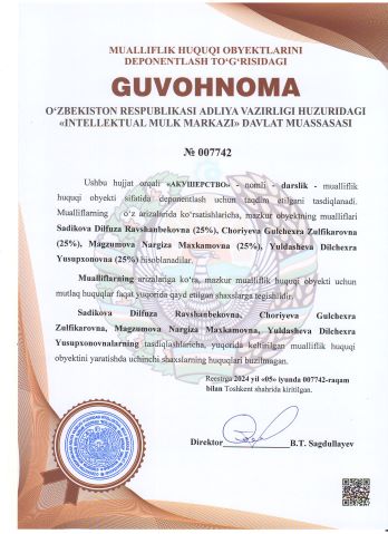| 2363 | №007741 | Darslik - "AKUSHERLIK" | Yuldasheva Dilchexra Yusupxonovna (25%), Choriyeva Gulchexra Zulfikarovna (25%), Sadikova Dilfuza Ravshanbekovna (25%), Magzumova Nargiza Maxkamovna (25%) | Yuldasheva Dilchexra Yusupxonovna, Choriyeva Gulchexra Zulfikarovna, Sadikova Dilfuza Ravshanbekovna, Magzumova Nargiza Maxkamovna | 06/05/2024 | ![]() |