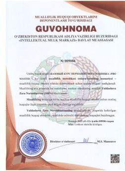 239 | №009086 | Mualliflik metodikasi onlayn-kursining ssenariysi – "БАЗОВЫЙ КУРС ПЕРМАНЕНТНОГО МАКИЯЖА «PRO MASTER - 3»" | Yuldasheva Zara Nuratdinovna (100%) | Yuldasheva Zara Nuratdinovna | 11.07.2025 | ![]() |