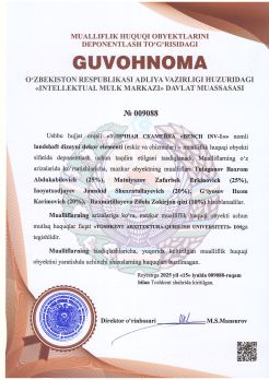 235 | №009090 | Landshaft dizayni dekor elementi (eskiz va chizmalar) – "КАШПО УЛИЧНОЕ «KASHPO INV-1»" | Nurimbetov Ravshan Ibragimovich (20%), Adilov Zarifjon Himmatovich (20%), Matniyazov Zafarbek Erkinovich (20%), Metyakubov Azamat Djumanazarovich (10%), Xasanov Azamat Ozadovich (10%), Mirzaxmedov Batir Xusniddinovich (10%), Raxmatillayeva Zilola Zokirjon qizi (10%) | «TOSHKENT ARXITEKTURA-QURILISH UNIVERSITETI» DM | 15.07.2025 | ![]() |