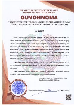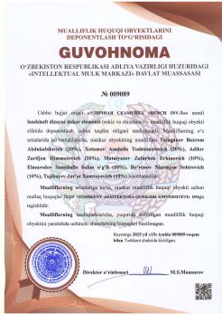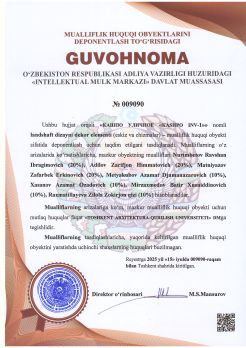 233 | №009092 | Landshaft dizayni dekor elementi (eskiz va chizmalar) – "КАШПО УЛИЧНОЕ «KASHPO INV-2»" | Matniyazov Zafarbek Erkinovich (20%), Adilov Zarifjon Himmatovich (20%), Kurbanova Nigora Baxtiyarovna (20%), Bo‘ronov Nizomjon Sobirovich (10%), Elmurodov Samidullo Salim o‘g‘li (10%), Tajibayev Jur’at Xamroyevich (10%), Ten Iroda Satimbayevna (10%) | «TOSHKENT ARXITEKTURA-QURILISH UNIVERSITETI» DM | 15.07.2025 | ![]() |