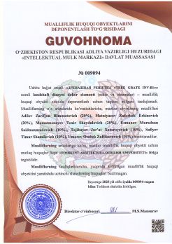 230 | №009095 | Landshaft dizayni dekor elementi (eskiz va chizmalar) – "ДРЕНАЖНАЯ РЕШЕТКА «TREE GRATE INV-B2»" | Matniyazov Zafarbek Erkinovich (20%), Adilov Zarifjon Himmatovich (20%), Mamatmusayev Toxir Shaydulovich (20%), Reyimbayev Shuxrat Sadullayevich (10%), Tajibayev Jur’at Xamroyevich (10%), Shoisoyev Izatullo Kenjayevich (10%), Raxmatillayeva Zilola Zokirjon qizi (10%) | «TOSHKENT ARXITEKTURA-QURILISH UNIVERSITETI» DM | 15.07.2025 | ![]() |
