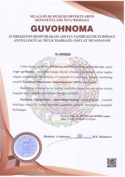 | 232 | №009886 | O‘quv-uslubiy qo’llanma – "MIKROORGANIZMLARNI IDЕNTIFIKATSIYASIDA MASS-SPЕKTROMЕTRIYANING QO‘LLANILISHI" | Yodgorova Nodira Turgunbayevna (34%), Mirvaliyeva Nafisa Rejametovna (33%), Abduraxmonova Karima Rashiddinovna (33%) | Yodgorova Nodira Turgunbayevna, Mirvaliyeva Nafisa Rejametovna, Abduraxmonova Karima Rashiddinovna | 02/09/2026 | ![]() |