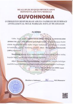 | 237 | №009881 | Ilmiy ishlanma (psixologik model) – "ИНТЕГРИРОВАННАЯ МОДЕЛЬ САМОПОЗНАНИЯ ЛИЧНОСТИ" | Aliyev Muxamadjon Choriyevich (100%) | Aliyev Muxamadjon Choriyevich | 02/06/2026 | ![]() |