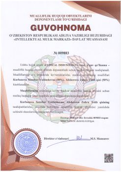 | 235 | №009883 | O’quv qo’llanma – "CLINICAL IMMUNOLOGY" | Kurbanova Sanobar Yuldashevna (50%), Alisherova Zuhra Tolib qizi (50%) | Kurbanova Sanobar Yuldashevna, Alisherova Zuhra Tolib qizi | 02/06/2026 | ![]() |