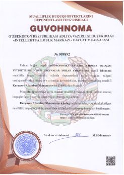 | 226 | №009892 | "GIDROPONIKA USULIDA CHORVA OZUQASI YETISHTIRISH UCHUN USKUNALAR ISHLAB CHIQARISH" nomli ishlanma | Kuryazov Adambay Shamuratovich (100%) | Kuryazov Adambay Shamuratovich | 02/10/2026 | ![]() |