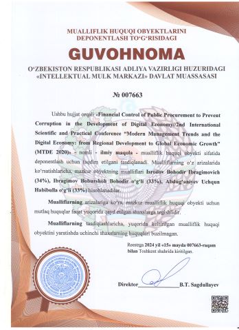 | 2440 | №007663 | Ilmiy maqola - "Financial Control of Public Procurement to Prevent Corruption in the Development of Digital Economy//2nd International Scientific and Practical Conference “Modern Management Trends and the Digital Economy: from Regional Development to Global Economic Growth” (MTDE 2020)" | Isroilov Bohodir Ibragimovich (34%), Ibragimov Boburshoh Bohodir o‘g‘li (33%), Abdug‘aniyev Uchqun Habibulla o‘g‘li (33%) | Isroilov Bohodir Ibragimovich, Ibragimov Boburshoh Bohodir o‘g‘li, Abdug‘aniyev Uchqun Habibulla o‘g‘li | 05/15/2024 | ![]() |
