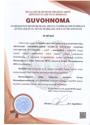 | 2438 | №007665 | Monografiya - "КЛИНИКО-ДИАГНОСТИЧЕСКАЯ ХАРАКТЕРИСТИКА ДИСПЛАЗИИ СОЕДИНИТЕЛЬНОЙ ТКАНИ В СТРУКТУРЕ СЕРДЕЧНО СОСУДИСТОЙ ПАТОЛОГИИ" | Muratxodjayeva Akida Valiyevna (50%), Axrarova Feruza Maxmudjanovna (50%) | Muratxodjayeva Akida Valiyevna, Axrarova Feruza Maxmudjanovna | 05/15/2024 | ![]() |