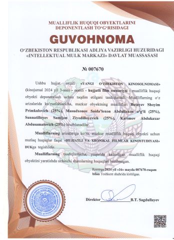 | 2434 | №007669 | Hujjatli film ssenariysi - "YANGI O‘ZBEKISTON KINOSOLNOMASI" (kinojurnal 2024 yil 2-son) | Gafarova Yulduz Rustam qizi (25%), Haydarov Ilhomjon Ergash o‘g‘li (25%), Sunnatilloyev Samijon Ziyodilloyevich (25%), Karimov Abdukaxar Abdusamatovich (25%) | "HUJJATLI VA XRONIKAL FILMLAR KINOSTUDIYASI" DUK | 05/16/2024 | ![]() |