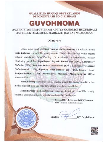| 2430 | №007673 | Ilmiy ishlanma - "МЕТОД ОПРЕДЕЛЕНИЯ ПРОЛИНА В МЁДЕ" | Sayfullayeva Zaynab Sunnat qizi (20%), Xamrakulov Gafurjan (20%), Xasanova Dilbar Yuldashevna (12%), Hamraqulov Mahmud Gofurjonovich (12%), Ziyodova lobar Baxodir qizi (12%), Ismoilov Bobir Xolqberdiyevich (12%), Turdialiyeva Mahzuna Muxtaraliyevna (12%) | Sayfullayeva Zaynab Sunnat qizi, Xamrakulov Gafurjan, Xasanova Dilbar Yuldashevna, Hamraqulov Mahmud Gofurjonovich, Ziyodova lobar Baxodir qizi, Ismoilov Bobir Xolqberdiyevich, Turdialiyeva Mahzuna Muxtaraliyevna | 05/16/2024 | ![]() |