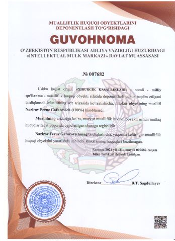| 2421 | №007682 | Milliy qo‘llanma - "XIRURGIK KASALLIKLARI" | Nazirov Feruz Gafurovich (100%) | Nazirov Feruz Gafurovich | 05/21/2024 | ![]() |