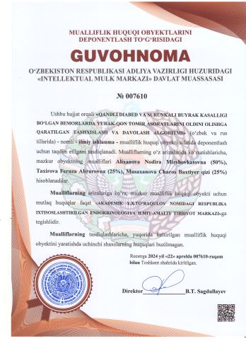 | 2493 | №007610 | Ilmiy ishlanma - "QANDLI DIABED VA SURUNKALI BUYRAK KASALLIGI BO‘LGAN BEMORLARDA YURAK-QON TOMIR ASORATLARINI OLDINI OLISHGA QARATILGAN TASHXISLASH VA DAVOLASH ALGORITMI" (o‘zbek va rus tillarida) | Alixanova Nodira Mirshovkatovna (50%), Taxirova Feruza Abrarovna (25%), Musaxanova Charos Baxtiyer qizi (25%) | AKADEMIK Y.X.TO‘RAQULOV NOMIDAGI RESPUBLIKA IXTISOSLASHTIRILGAN ENDOKRINOLOGIYA ILMIY-AMALIY TIBBIYOT MARKAZI | 04/22/2024 | ![]() |