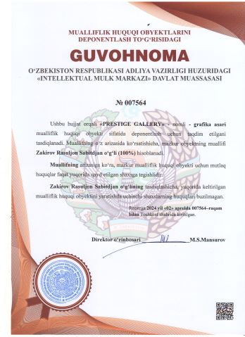 | 2539 | №007564 | grafika asari - "PRESTIGE GALLERY" | Zakirov Rasuljon Sabitdjan o‘g‘li (100%) | Zakirov Rasuljon Sabitdjan o‘g‘li | 04/02/2024 | ![]() |