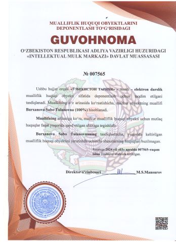 | 2538 | №007565 | elektron darslik - "ЎЗБЕКИСТОН ТАРИХИ" | Burxanova Sabo Tulanovna (100%) | Burxanova Sabo Tulanovna | 04/03/2024 | ![]() |