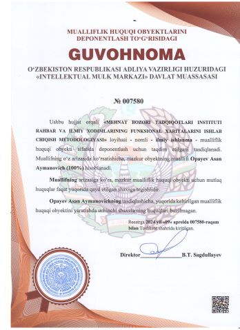 | 2523 | №007580 | Ilmiy ishlanma - "MEHNAT BOZORI TADQIQOTLARI INSTITUTI RAHBAR VA ILMIY XODIMLARINING FUNKSIONAL XARITALARINI ISHLAB CHIQISH METODOLOGIYASI" loyihasi | Opayev Asan Aymanovich (100%) | Opayev Asan Aymanovich | 04/09/2024 | ![]() |