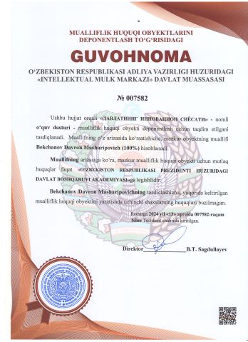 | 2521 | №007582 | O‘quv dasturi - "ДАВЛАТНИНГ ИННОВАЦИОН СИЁСАТИ" | Bekchanov Davron Masharipovich (100%) | O‘ZBEKISTON RESPUBLIKASI PREZIDENTI HUZURIDAGI DAVLAT BOSHQARUVI AKADEMIYASI | 04/13/2024 | ![]() |