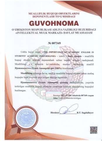 | 2752 | №007349 | Ilmiy maqola - "THE IMPORTANCE OF ACADEMIC ENGLISH IN STUDENTS’ ACADEMIC PERFORMANSE" | Djumanazarova Ziyada Amangeldi qizi (100%) | Djumanazarova Ziyada Amangeldi qizi | 12/26/2023 | ![]() |