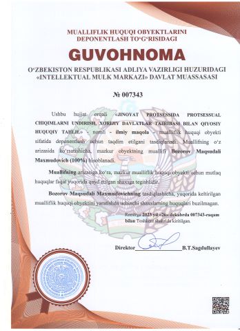 | 2758 | №007343 | Ilmiy maqola - "JINOYAT PROTSESSIDA PROTSESSUAL CHIQIMLARNI UNDIRISH, XORIJIY DAVLATLAR TAJRIBASI BILAN QIYOSIY HUQUQIY TAHLIL" | Bozorov Maqsudali Maxmudovich (100%) | Bozorov Maqsudali Maxmudovich | 12/26/2026 | ![]() |