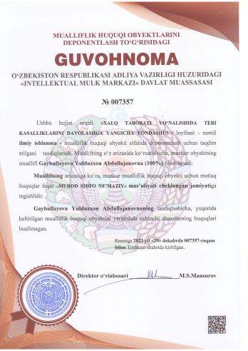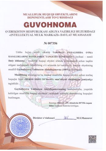 | 2744 | №007357 | Ilmiy ishlanma - "XALQ TABOBATI YO‘NALISHIDA TERI KASALLIKLARINI DAVOLASHGA YANGICHA YONDASHUV" loyihasi | Gaybullayeva Yulduzxon Abdullajanovna (100%) | "MUROD SHIFO NE’MATIY" mas’uliyati cheklangan jamiyati | 12/29/2023 | ![]() |