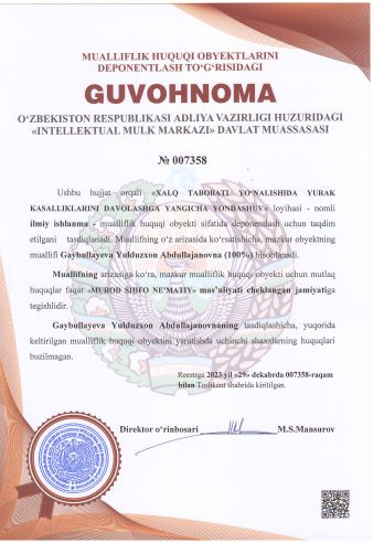 | 2743 | №007358 | Ilmiy ishlanma - "XALQ TABOBATI YO‘NALISHIDA YURAK KASALLIKLARINI DAVOLASHGA YANGICHA YONDASHUV" loyihasi | Gaybullayeva Yulduzxon Abdullajanovna (100%) | "MUROD SHIFO NE’MATIY" mas’uliyati cheklangan jamiyati | 12/29/2023 | ![]() |