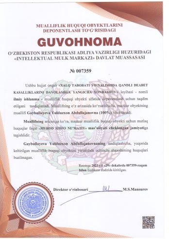 | 2742 | №007359 | Ilmiy ishlanma - "XALQ TABOBATI YO‘NALISHIDA QANDLI DEABET KASALLIKLARINI DAVOLASHGA YANGICHA YONDASHUV" loyihasi | Gaybullayeva Yulduzxon Abdullajanovna (100%) | "MUROD SHIFO NE’MATIY" mas’uliyati cheklangan jamiyati | 12/29/2023 | ![]() |