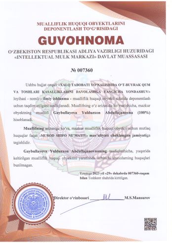 | 2741 | №007360 | Ilmiy ishlanma - "XALQ TABOBATI YO‘NALISHIDA O‘T-BUYRAK QUM VA TOSHLARI KASALLIKLARINI DAVOLASHGA YANGICHA YONDASHUV" loyihasi | Gaybullayeva Yulduzxon Abdullajanovna (100%) | "MUROD SHIFO NE’MATIY" mas’uliyati cheklangan jamiyati | 12/29/2023 | ![]() |