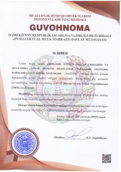 | 280 | №009838 | Uslubiy tavsiyanoma – "BIOLOGIK O‘G‘ITNI ISHLAB CHIQARISH VA QO‘LLASHDA ATROF MUHITNI IFLOSLANISH DARAJASINI GIGIYENIK BAHOLASH" | Sherqo‘ziyeva Guzal Faxritdinovna (100%) | Sherqo‘ziyeva Guzal Faxritdinovna | 01/30/2026 | ![]() |