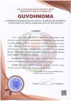 | 279 | №009839 | Ilmiy maqola – "THE IMPACT OF LIVING ENVIRONMENT AND ECOLOGICAL FACTORS ON THE DEVELOPMENT OF CHRONIC LIVER DISEASES" | Jalolov Nozimjon Nodir o‘g‘li (25%), Raximov Baxodir Baxtiyor o‘g‘li (25%), Sherqo‘ziyeva Guzal Faxritdinovna (25%), Sultonov Erkin Yoqubjon o‘g‘li (25%) | Jalolov Nozimjon Nodir o‘g‘li, Raximov Baxodir Baxtiyor o‘g‘li, Sherqo‘ziyeva Guzal Faxritdinovna, Sultonov Erkin Yoqubjon o‘g‘li | 01/30/2026 | ![]() |