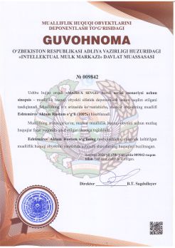 | 276 | №009842 | "MAJRUX SEVGI" nomli serial ssenariysi uchun sinopsis | Eshtemirov Aktam Rustam o‘g‘li (100%) | Eshtemirov Aktam Rustam o‘g‘li | 01/30/2026 | ![]() |