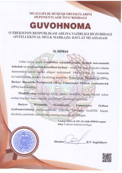 | 274 | №009844 | "VESKORQ" uskunasi asosida dinamik muvozanatni baholash va rivojlantirish metodikasi loyihasi | Xolxo‘jayev Murotxo‘ja (25%), Buriyev Muradulla Norbekovich (50%), Usmanxanov Orifxon Ayubxanovich (25%) | Xolxo‘jayev Murotxo‘ja, Buriyev Muradulla Norbekovich, Usmanxanov Orifxon Ayubxanovich | 02/02/2026 | ![]() |