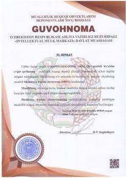 | 268 | №009850 | O‘quv qo‘llanma – "QON FIZIOLOGIYASI FARMAKOLOGIYA ASOSLARI BILAN" | Yunusov Abdushukur Abdulaxatovich (34%), Askaryans Vera Petrovna (33%), Babadjanova Feruza Abdumalikovna (33%) | Yunusov Abdushukur Abdulaxatovich, Askaryans Vera Petrovna, Babadjanova Feruza Abdumalikovna | 02/03/2026 | ![]() |