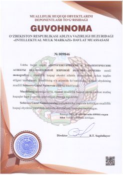 | 272 | №009846 | Monografiya – "ПАТОГЕНЕТИЧЕСКИЕ И ТЕРАПЕВТИЧЕСКИЕ АСПЕКТЫ НЕАЛКОГОЛЬНОЙ ЖИРОВОЙ БОЛЕЗНИ ПЕЧЕНИ" | Sobirova Guzal Naimovna (100%) | Sobirova Guzal Naimovna | 02/02/2026 | ![]() |