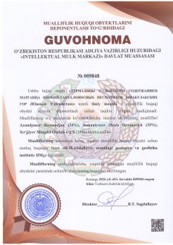 | 269 | №009849 | Ilmiy maqola – "JANUBIY NUROTA TOG‘LARIDA ENDOGЕN MA’DANLASHUVNI HOSIL BO‘LISH VA JOYLASHUVINING BASHORAT-QIDIRUV MODЕLI" | Karabayev Mamatxan Sadirovich (20%), Amirov Elmurod Mansuriddin o‘g‘li (20%), Orolov Azizbek Kaimjanovich (15%), Yusupov Abdisalim Bobomurod o‘g‘li (15%), Sadirov Rustam Mamatxon o‘g‘li (15%), Baxtiyorov Oybek Egamberdi o‘g‘li (15%) | "H.M.Abdullayev nomidagi geologiya va geofizika instituti" DM | 02/03/2026 | ![]() |